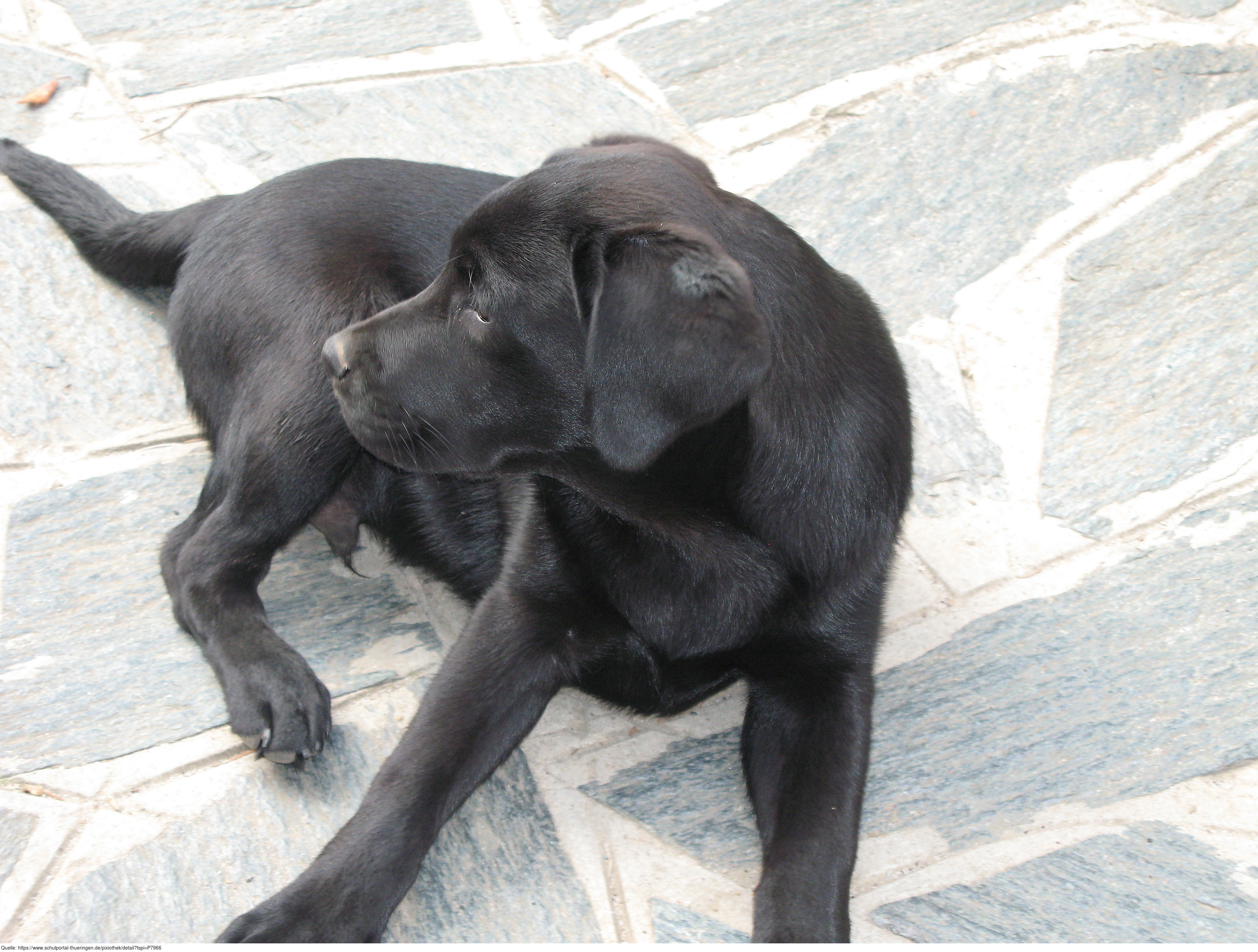 Das Foto hehört zur Serie Hunde. Es zeigt einen jungen schwarzen Labrador Retriever. Es gelten die Nutzungsbedingungen der Mediothek und Pixiothek.