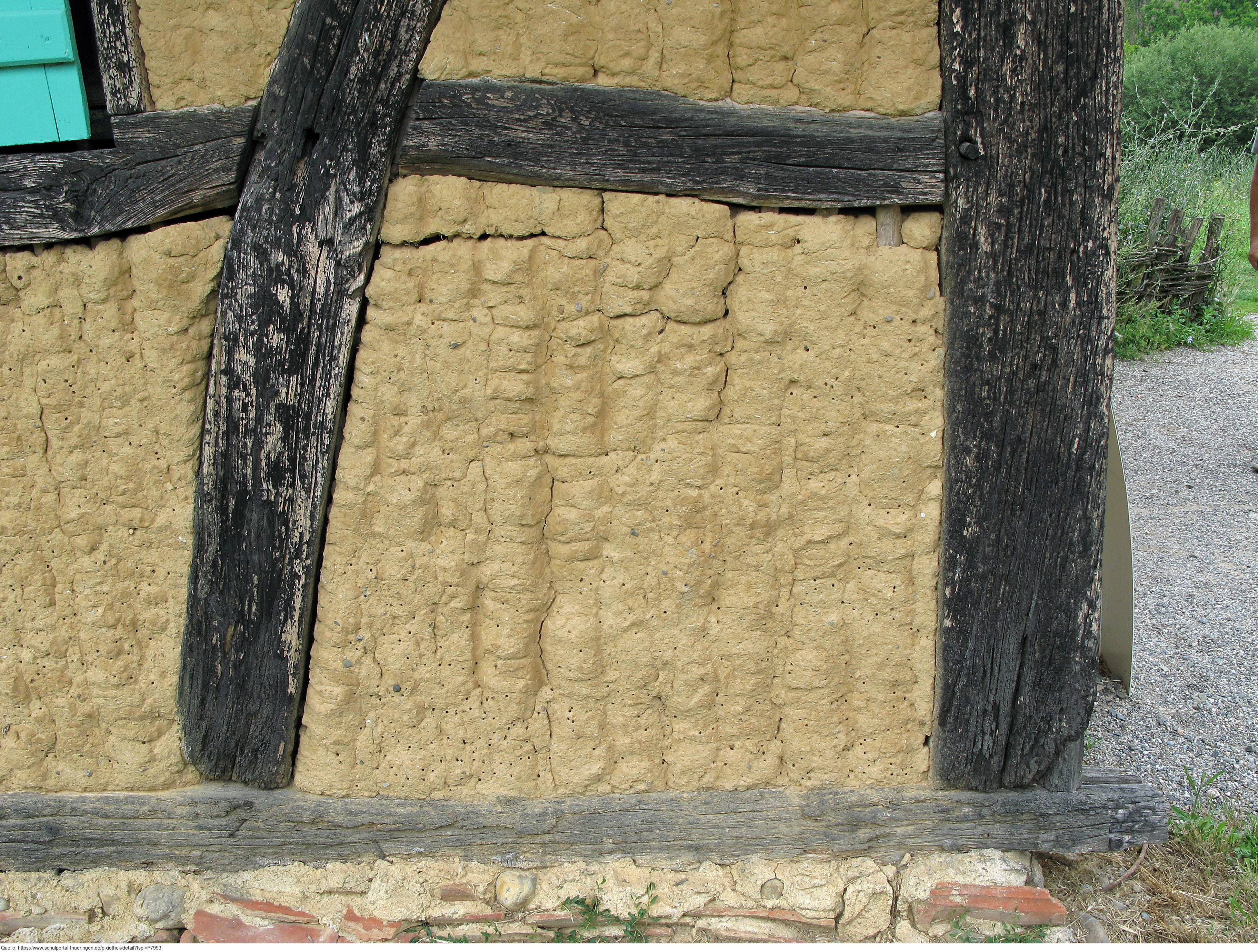 Das Foto gehört zur Serie Fachwerkhäuser. Es zeigt ein Gefach mit Lehmausfachung. Dazu wurden Lehmstaken (längliche Stücke aus gespaltenem Holz) senkrecht in das Gefach eingebaut und diese mit Strohlehm umwickelt. Das Gefach kann dann noch mit Lehm beworfen werden, um eine glatte Oberfläche zu erhalten. Es gelten die Nutzungsbedingungen der Mediothek und Pixiothek.