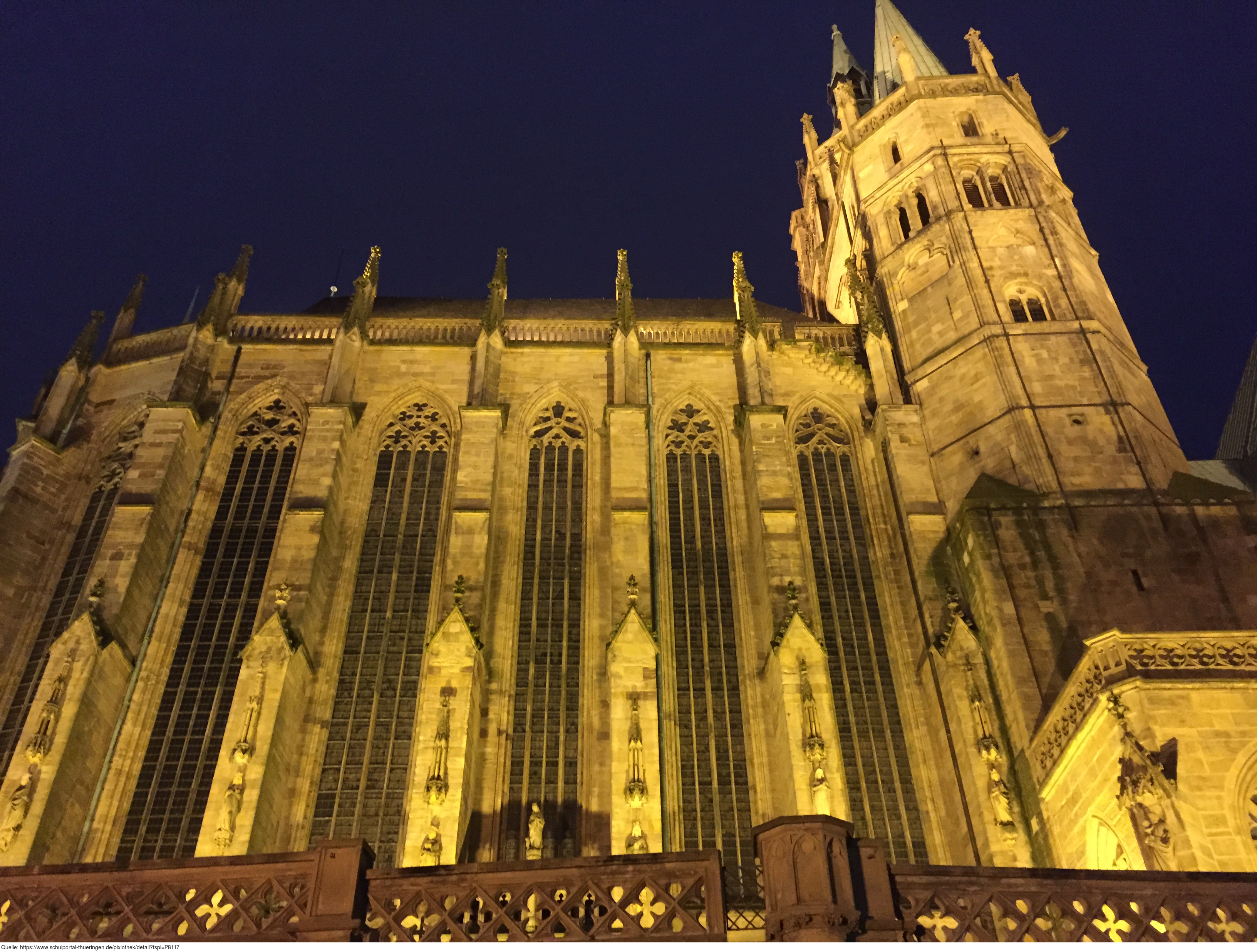 Abgebildet ist der beleuchtete Erfurter Dom bei Nacht, aufgenommen zum Weihnachtsmarkt 2018. Es gelten die Nutzungsbedingungen der Mediothek und Pixiothek.