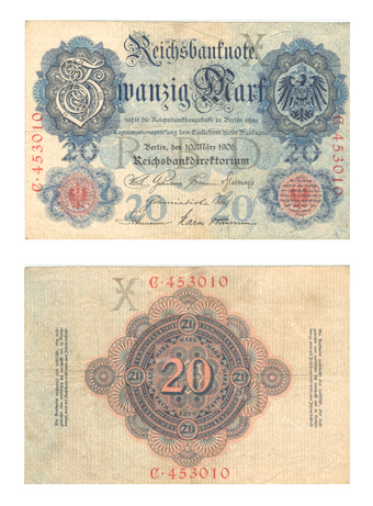 Das Foto gehört zur Serie "Währungen im Deutschen Kaiserreich bis 1914". Es zeigt die Reichsbanknote Zwanzig Mark vom 10. März 1906. Es gelten die Nutzungsbedingungen der Mediothek und Pixiothek.