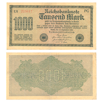 Das Foto gehört zur Serie "Zahlungsmittel in der Weimarer Republik (1918-1933)". Es zeigt eine Reichsbanknote über "Tausend Mark" vom 15. September 1922. Es gelten die Nutzungsbedingungen der Mediothek und Pixiothek.