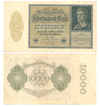 Das Foto gehört zur Serie "Zahlungsmittel in der Weimarer Republik (1918-1933)". Es zeigt eine Reichsbanknote über "Zehntausend Mark" vom 19. Januar 1922. Es gelten die Nutzungsbedingungen der Mediothek und Pixiothek.