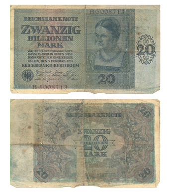 Das Foto gehört zur Serie "Zahlungsmittel in der Weimarer Republik (1918-1933)". Es zeigt eine Reichsbanknote über "Zwanzig Billionen Mark" vom 05. Februar 1924. Es gelten die Nutzungsbedingungen der Mediothek und Pixiothek.