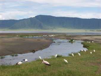 Das Bild wurde in Tansania aufgenommen. Es zeigt im Vordergrund u.a. zwei Heilige Ibisse (Threskiornis aethiopicus) und einen Nimmersatt (Mycteria ibis). Es gelten die Nutzungsbedingungen der Mediothek und Pixiothek.