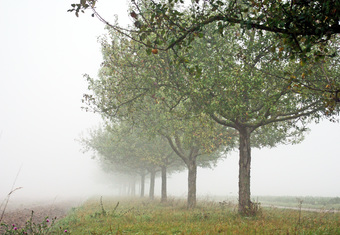 Straße mit Apfelbäumen im Nebel