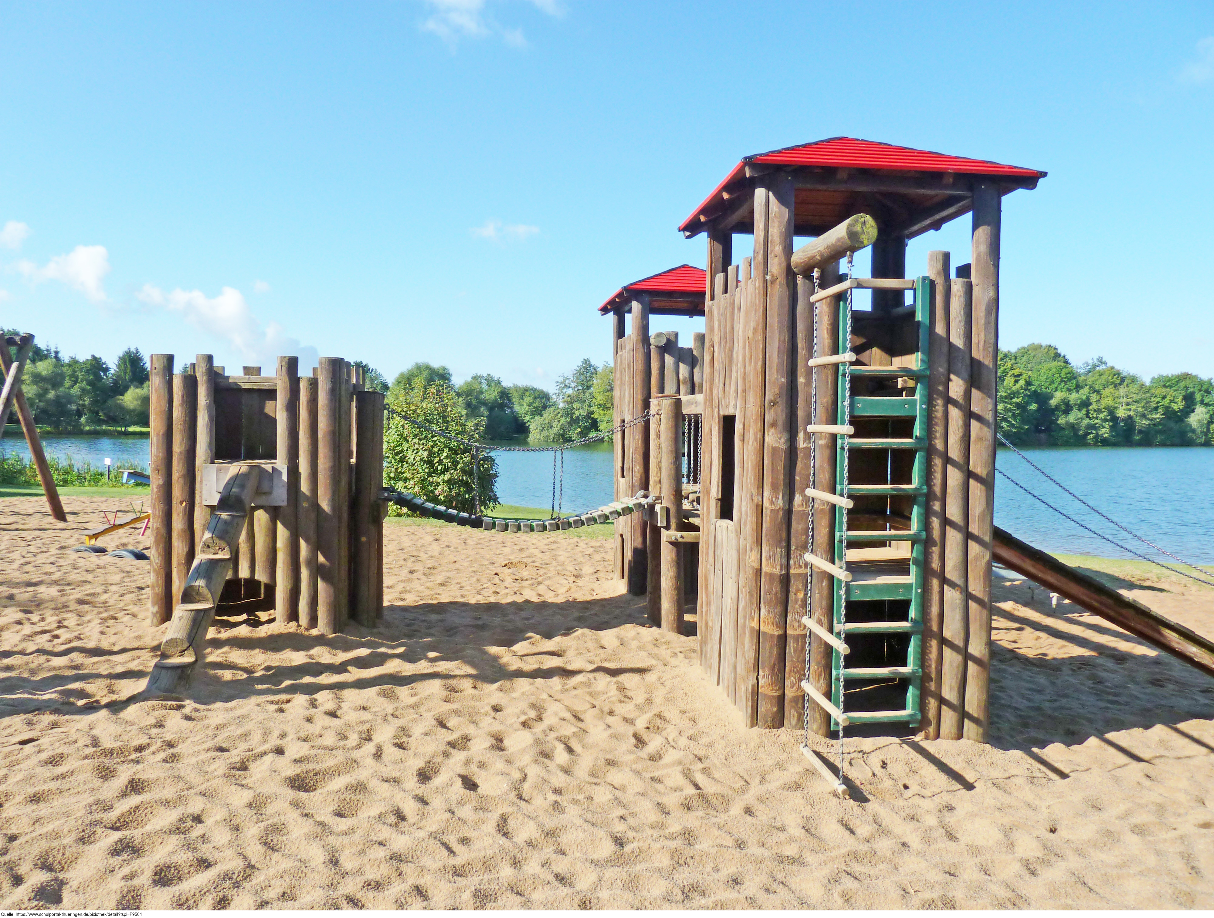 Das Foto zeigt einen Kinderspielplatz mit Klettergerüst und Holzhäusern am See. Das Bild ist unter CC0 lizenziert und kann somit frei verwendet werden.