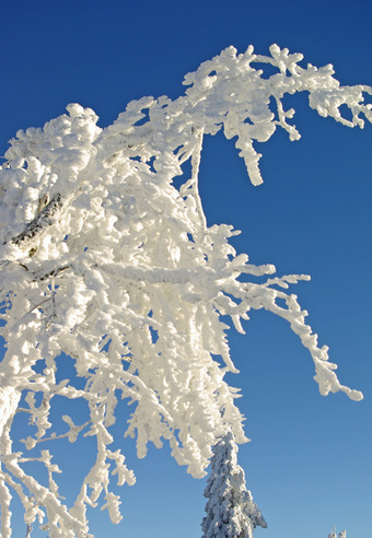 Das Bild gehört zur Serie "Winterlandschaft". Es zeigt verschneite Äste eines Baumes. Das Bild ist unter CC0 lizenziert und kann somit frei verwendet werden.