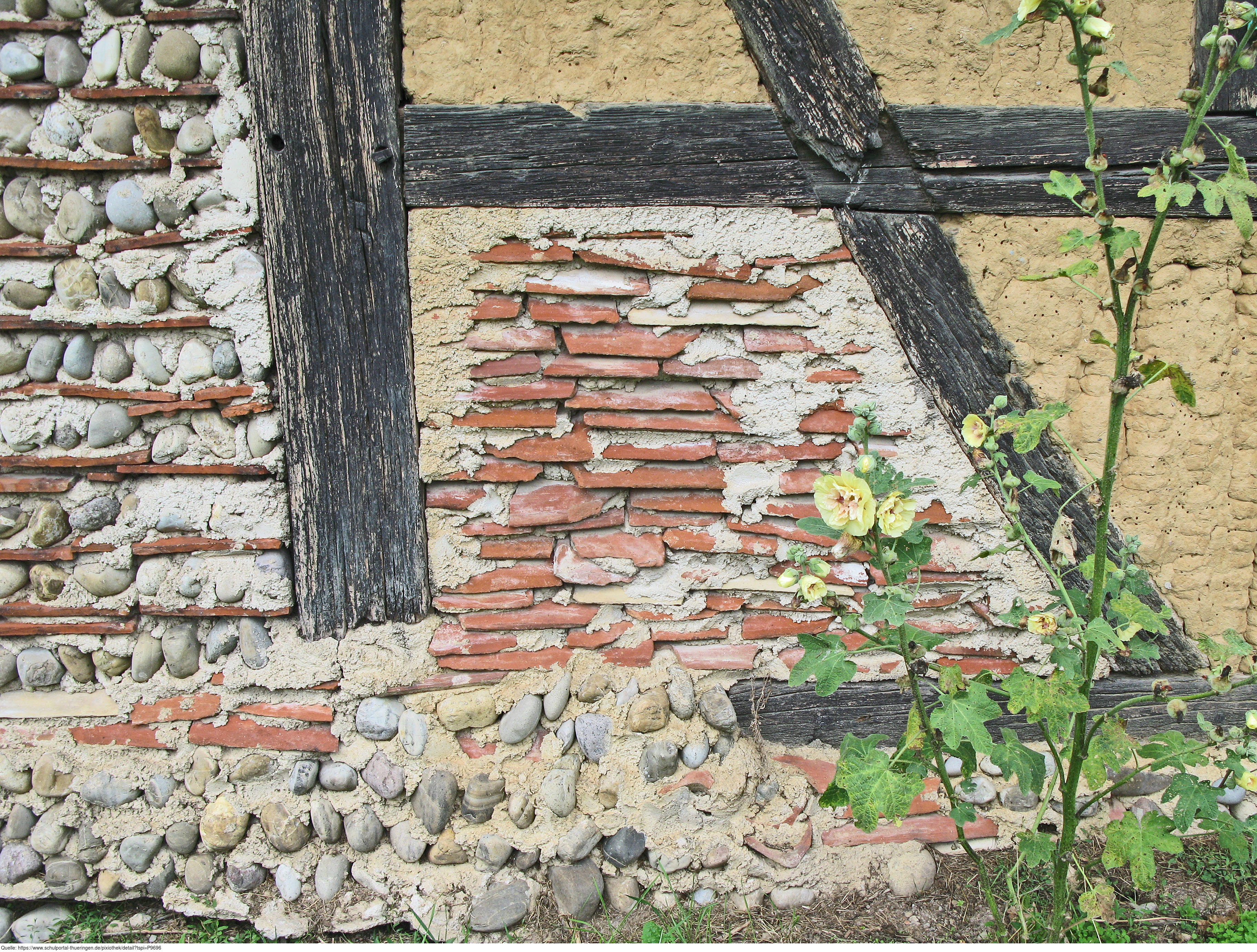 Das Foto gehört zur Serie Fachwerkhäuser. Es zeigt ein Gefach, dass mit gebrauchten Dachziegeln ausgemauert wurde. Das Gefach konnte dann noch mit Lehm beworfen werden, um eine glatte Oberfläche zu erhalten. Es gelten die Nutzungsbedingungen der Mediothek und Pixiothek.